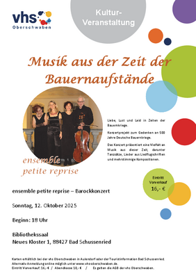 Als kultureller Höhepunkt in unserem Herbst-/Wintersemester findet am Sonntag, 12. Oktober 2025 das Konzert „Liebe, Lust und Leid in Zeiten der Bauernkriege“ vom ensemble petite reprise in Bad Schussenried statt.